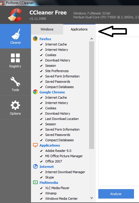 Pertama sekali, buka software aplikasi "CCleaner" dan conteng semuanya pada tab "Windows".