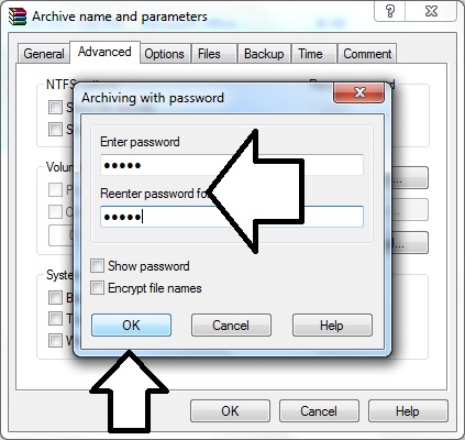 Kemudian akan muncul jendela "Archiving with password", maka masukkan password anda! Pada kasus saya ini, password yang saya masukkan yaitu "12345" sebagai contoh. Lalu klik "Ok" untuk persetujuan.